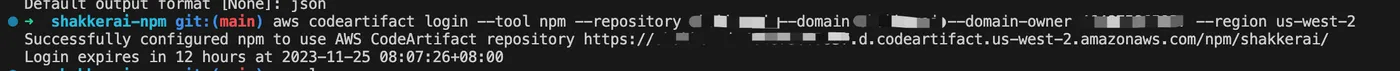 aws codeartifact login --tool npm --repository domain --domain domain --domain-owner accountid --region us-west-2