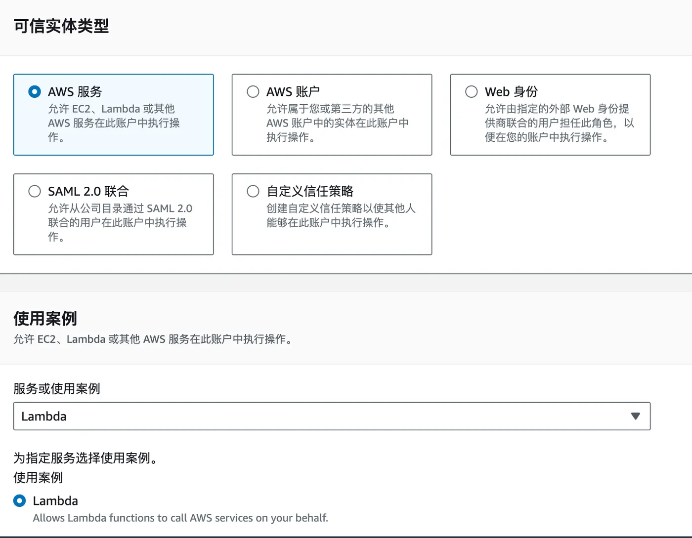 Create an AWS service role, selecting Lambda as the use case.