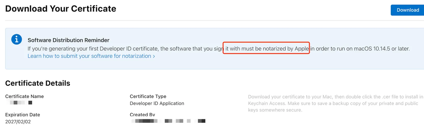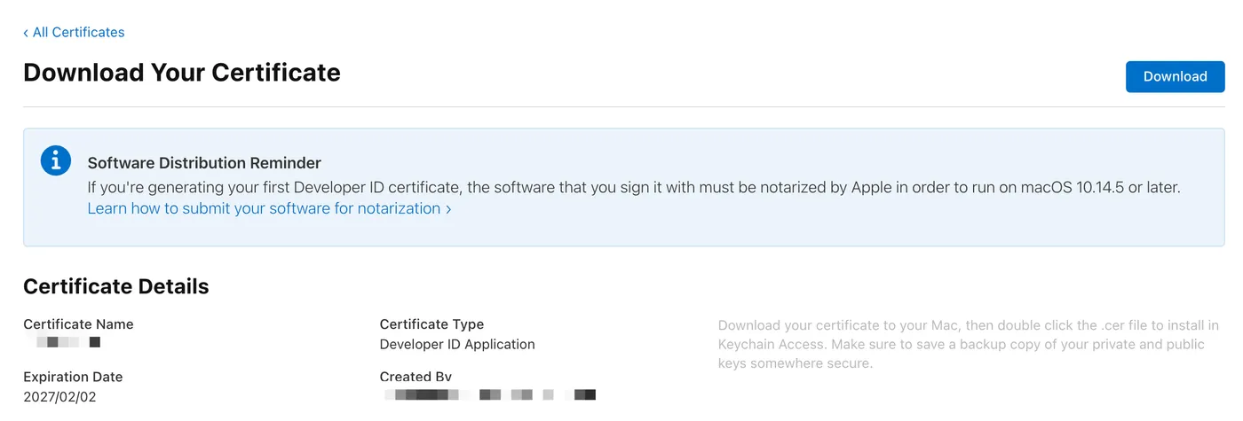 The certificate is now created. Click download to save it locally: