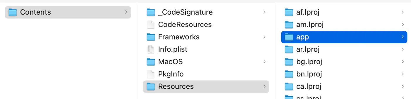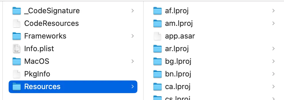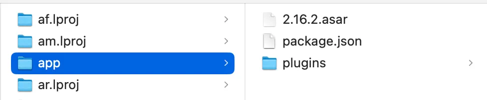 2. Inside the app folder, the Node.js main process + renderer parts are bundled into a single asar file — keeping the size small and easy to update