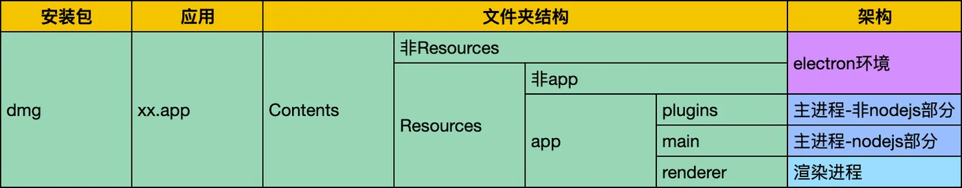 2. Main process — non-Node.js part: refers to C++ components like dylib, node files, etc. Changes are also rare. If needed, a full update is recommended.