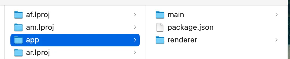 With default packaging, the app folder contains main and renderer folders: