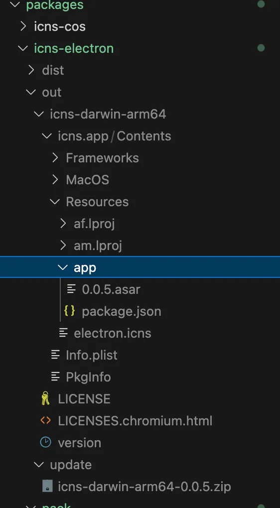 2. out/update contains a zip of the asar file, ready for subsequent updates