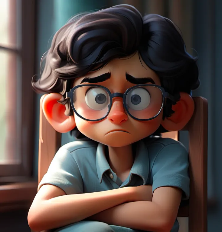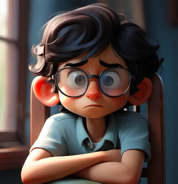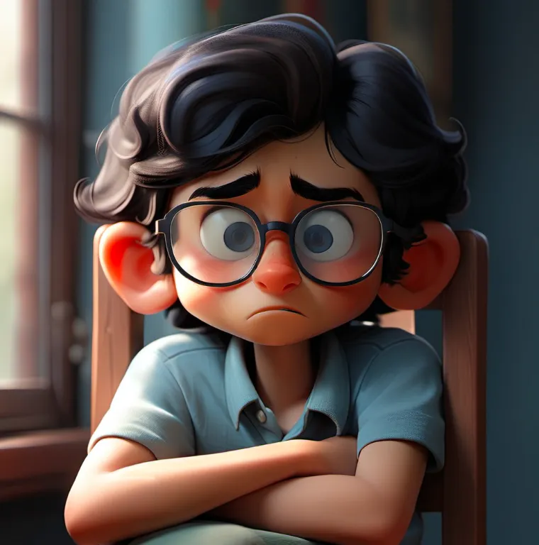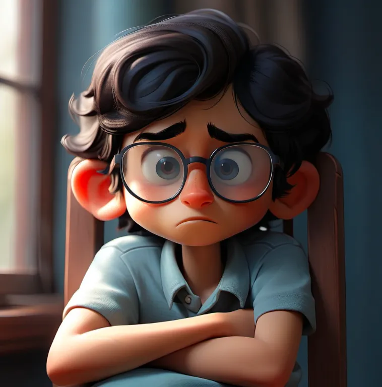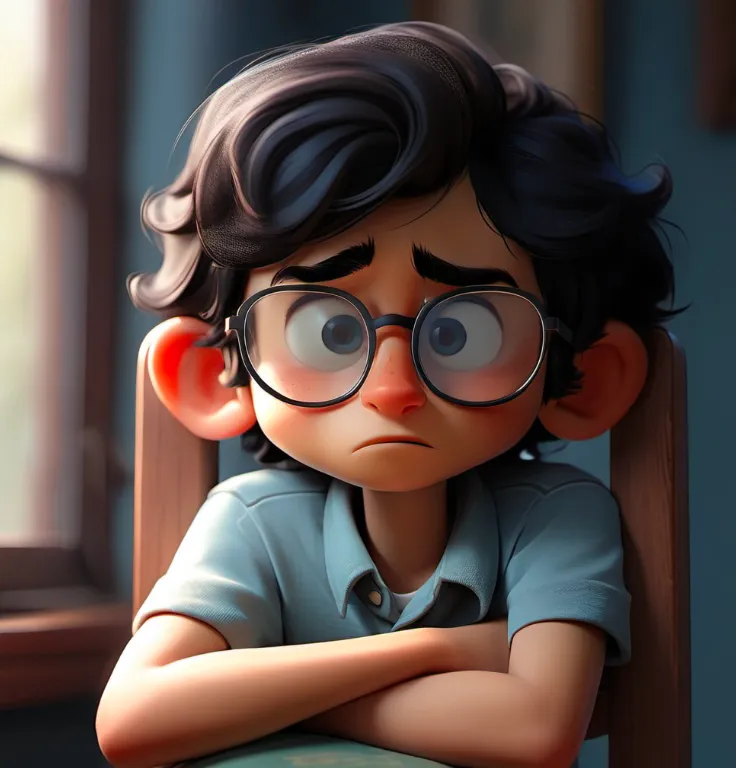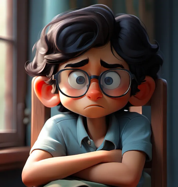 一个男孩,坐在椅子上,上半身,靠近窗口,蓝色上衣,黑色头发,戴眼镜,面向镜头,左手边是窗子