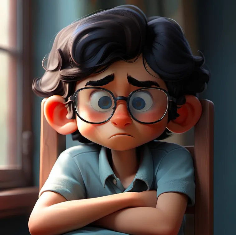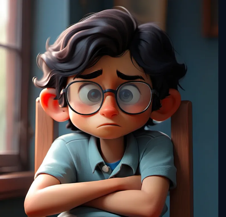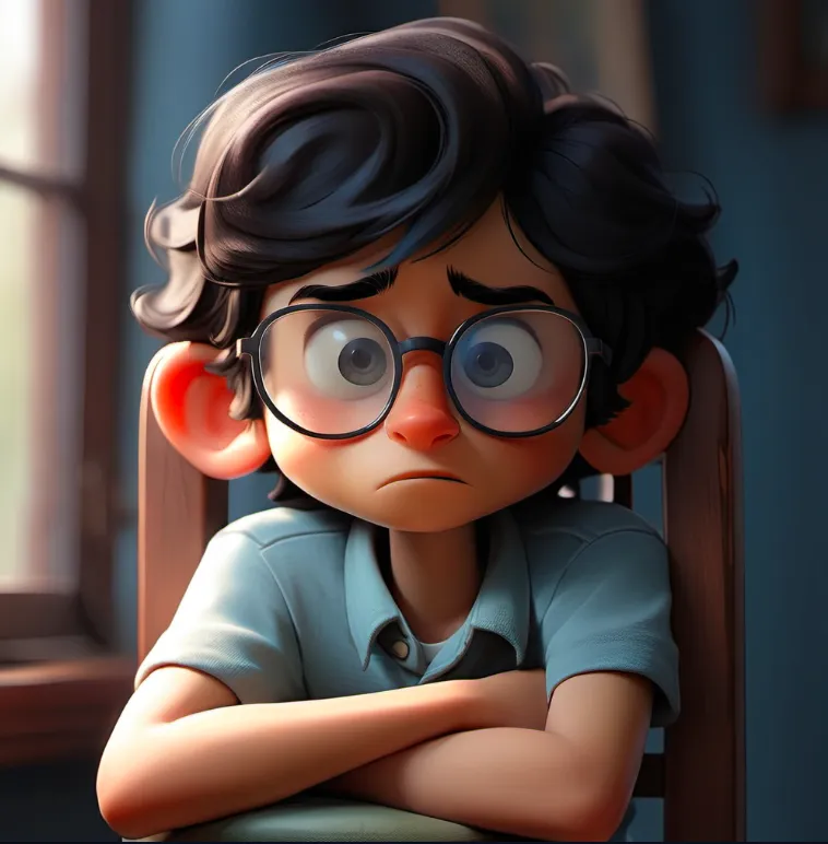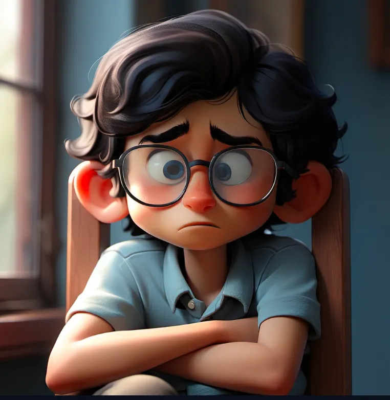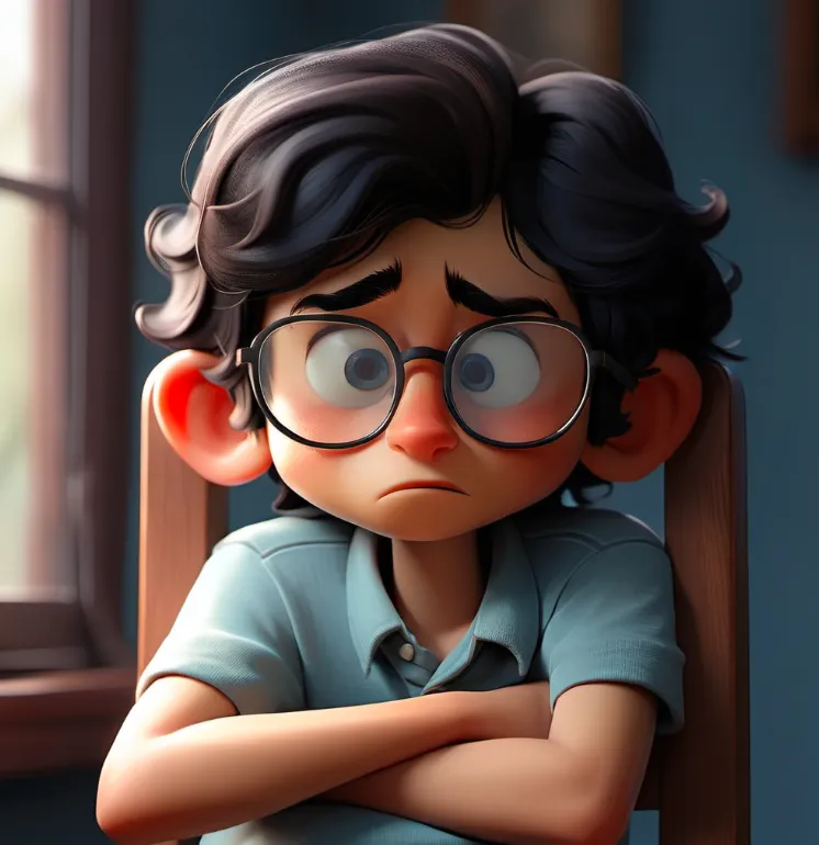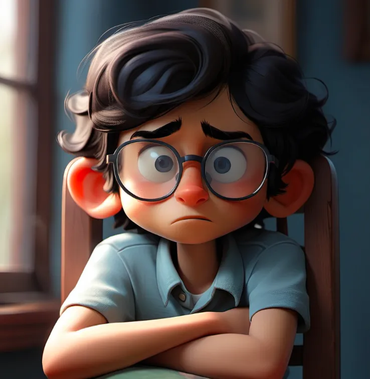 一个男孩,坐在椅子上,上半身,靠近窗口,蓝色上衣,黑色头发,戴眼镜,面向镜头,左手边是窗子