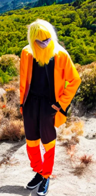 A teenager with yellow hair, wearing a headband, dressed in an orange and black striped outfit, struck some cool poses, standing on a mountaintop, looking at the camera.