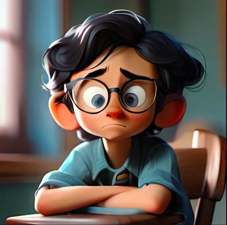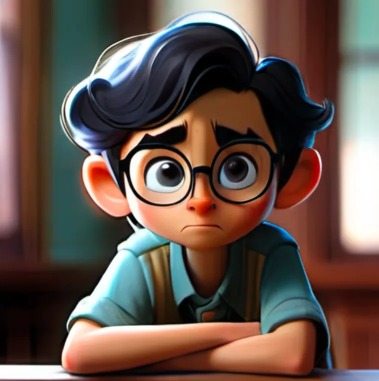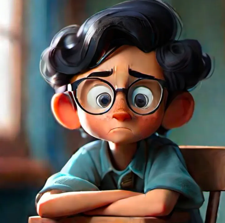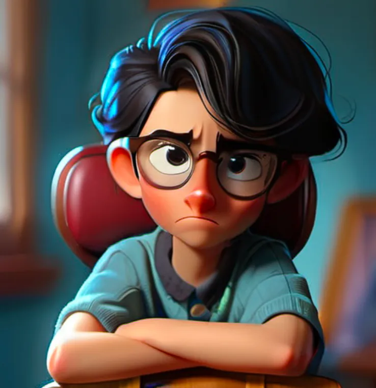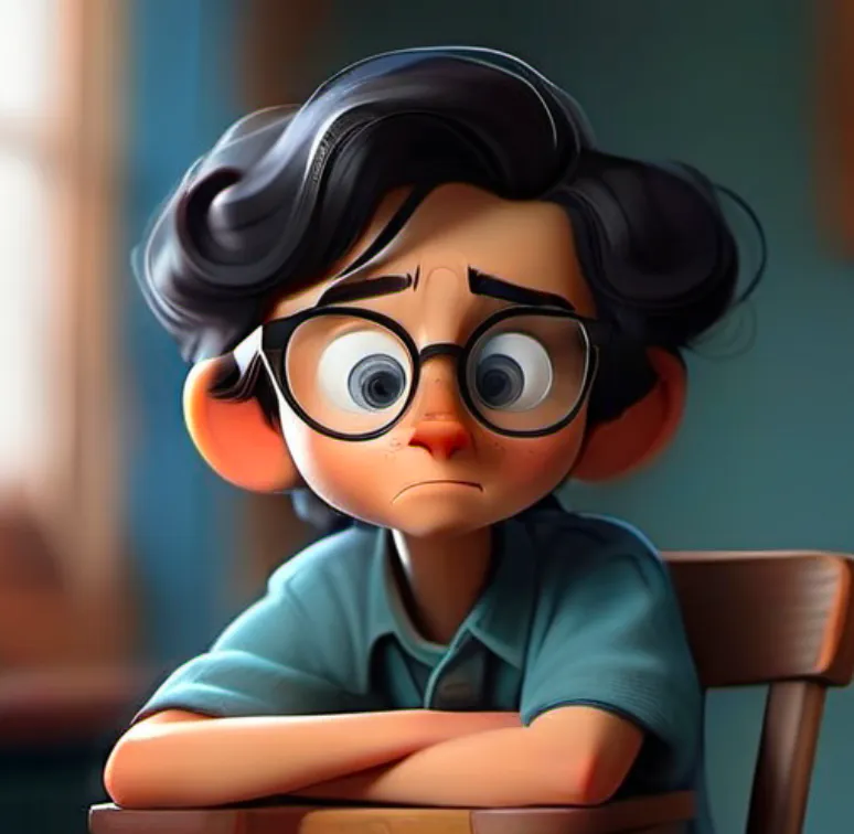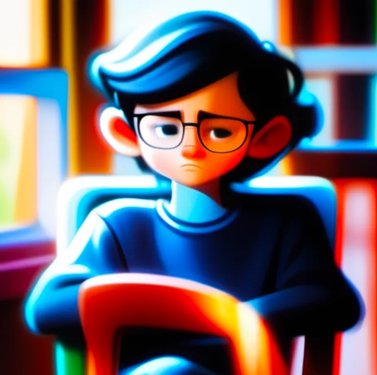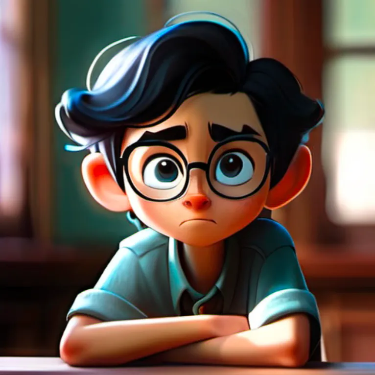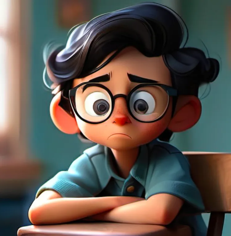 一个男孩,坐在椅子上,上半身,靠近窗口,蓝色上衣,黑色头发,戴眼镜,面向镜头,左手边是窗子