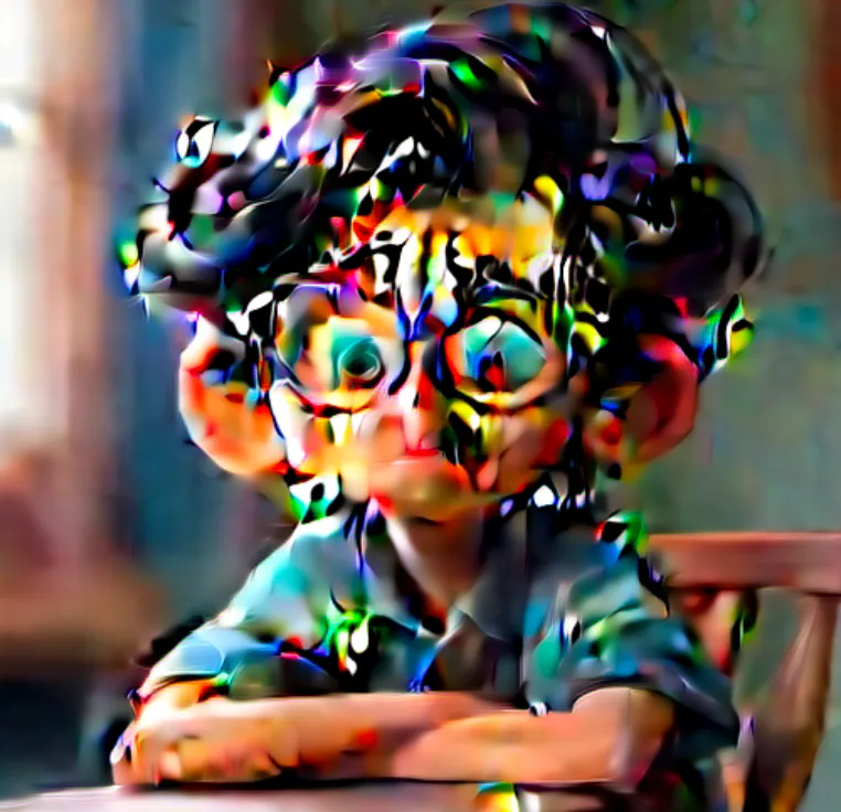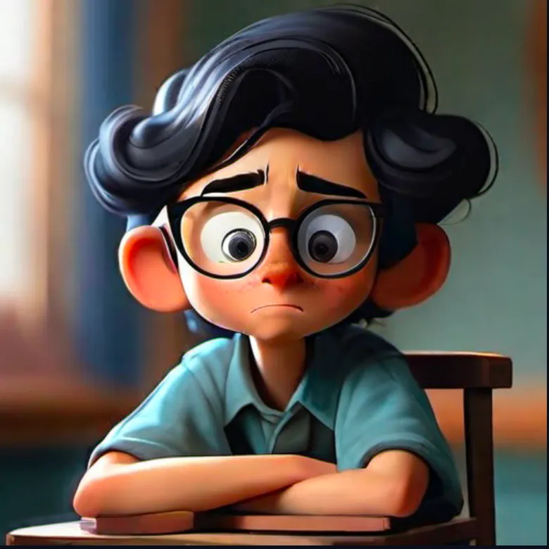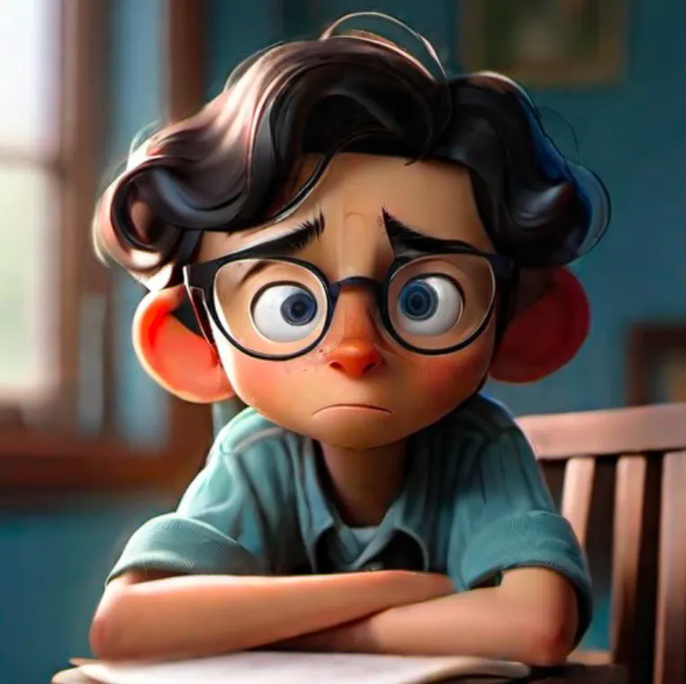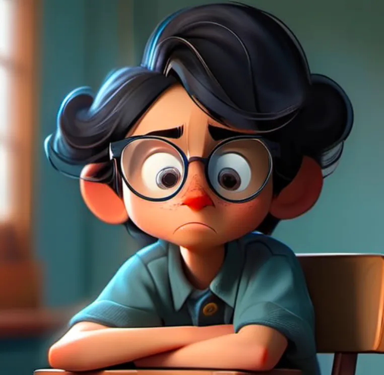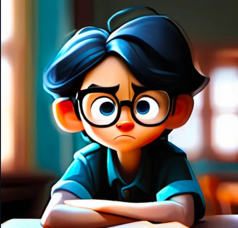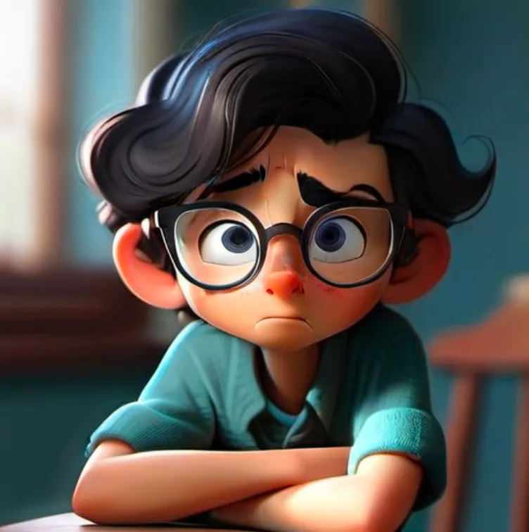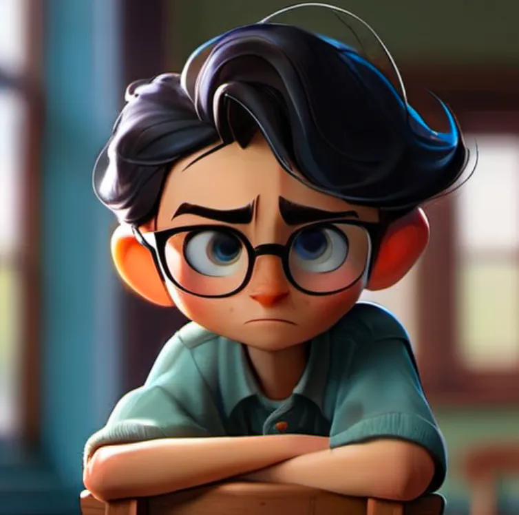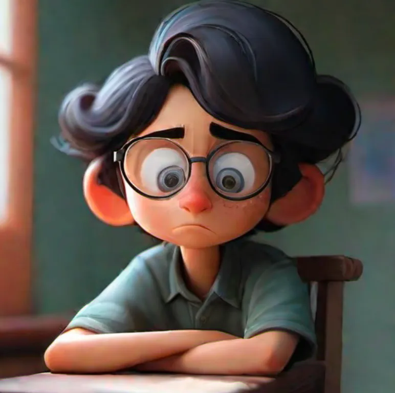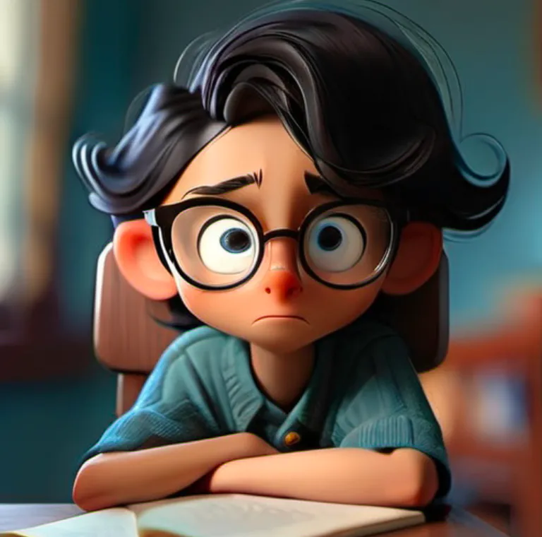 一个男孩,坐在椅子上,上半身,靠近窗口,蓝色上衣,黑色头发,戴眼镜,面向镜头,左手边是窗子