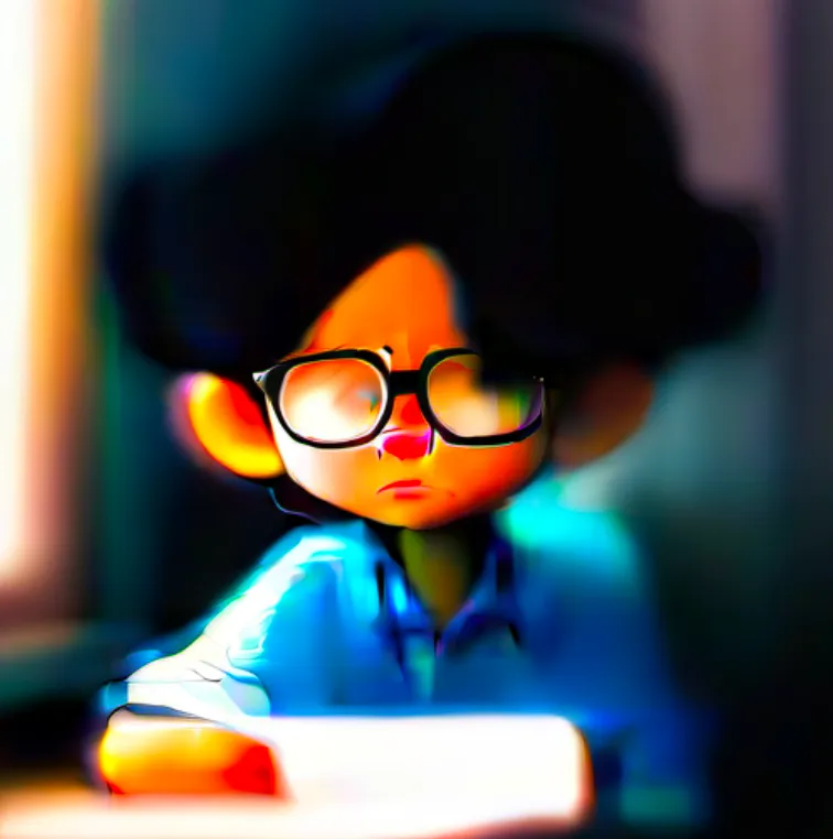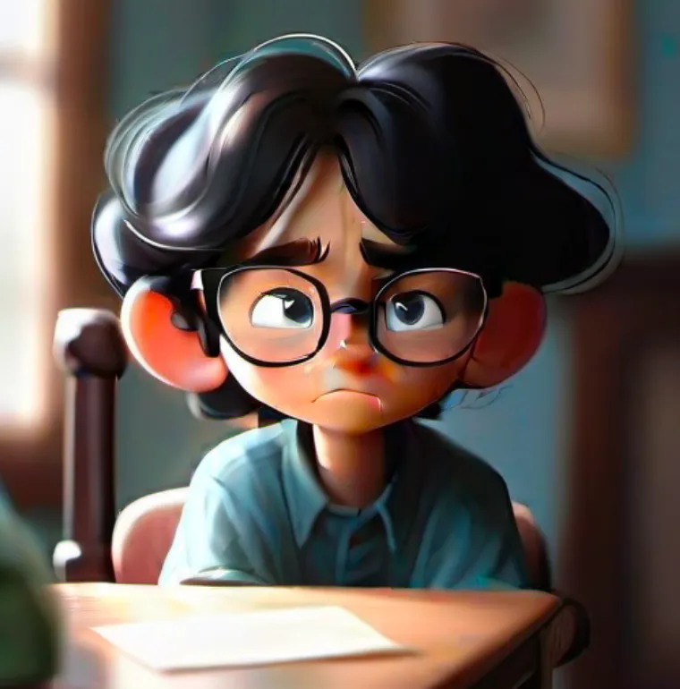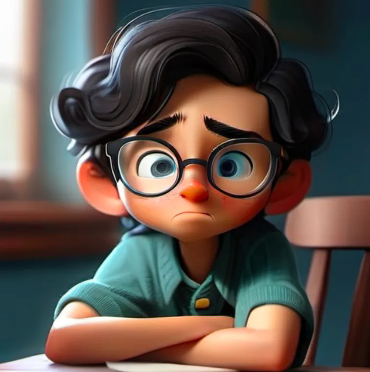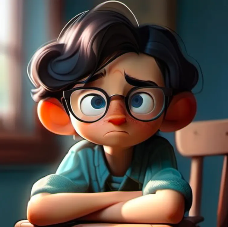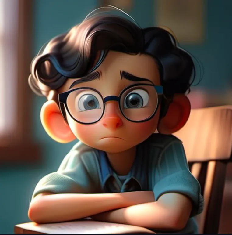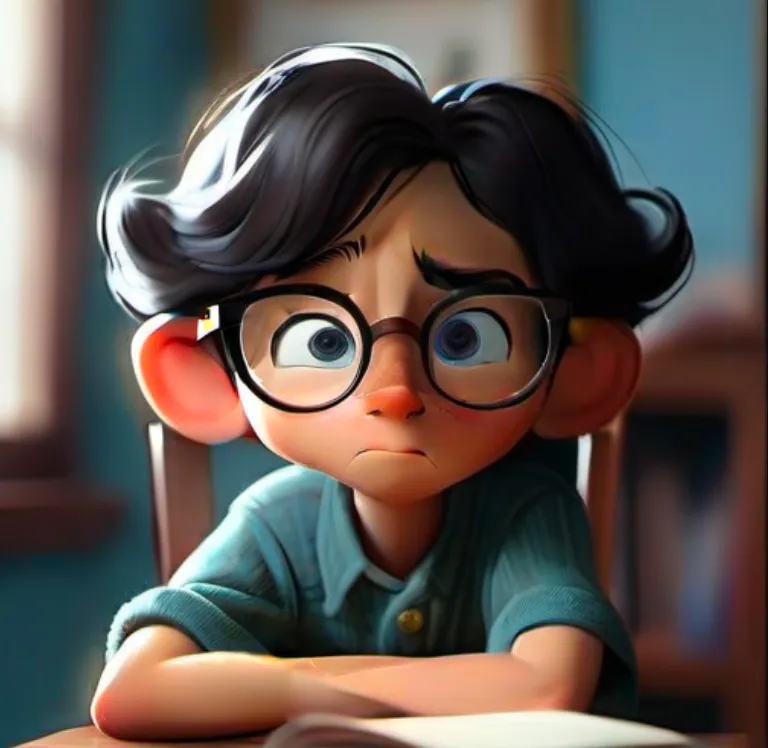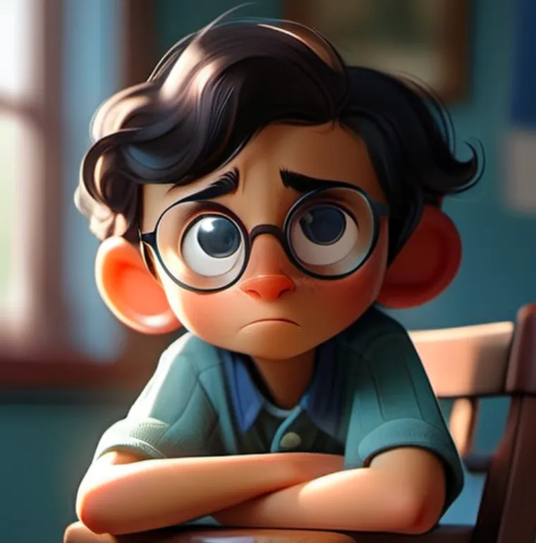 一个男孩,坐在椅子上,上半身,靠近窗口,蓝色上衣,黑色头发,戴眼镜,面向镜头,左手边是窗子