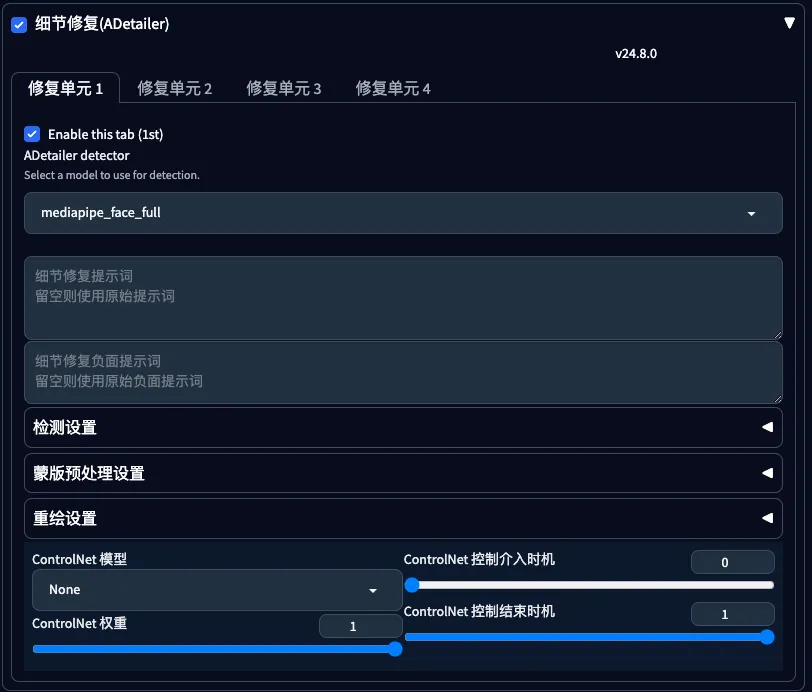 |—Supports detail restoration (ADetailer), with 11 built-in restoration models